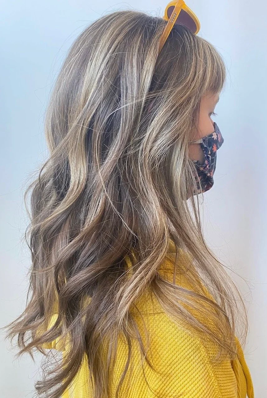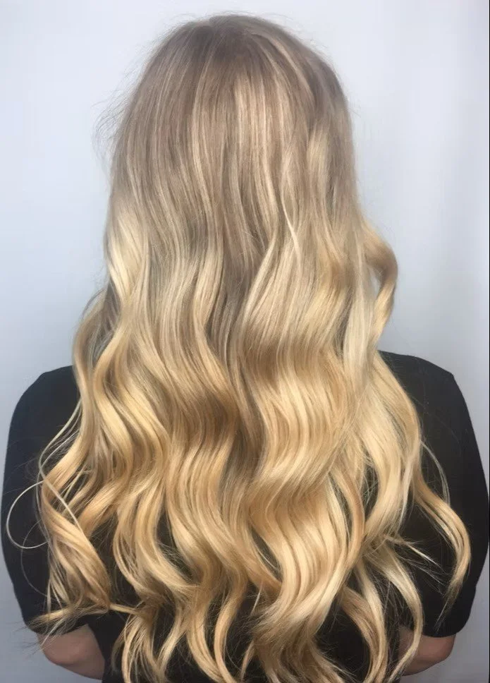 Long hair with loose, wavy curls in shades of light brown and blonde.