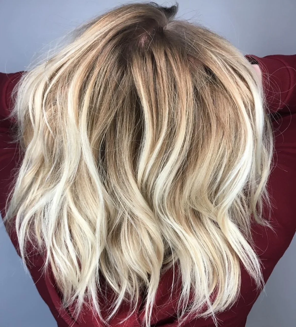 The image shows a close-up of a person's wavy, blonde hair with darker roots, viewed from above.