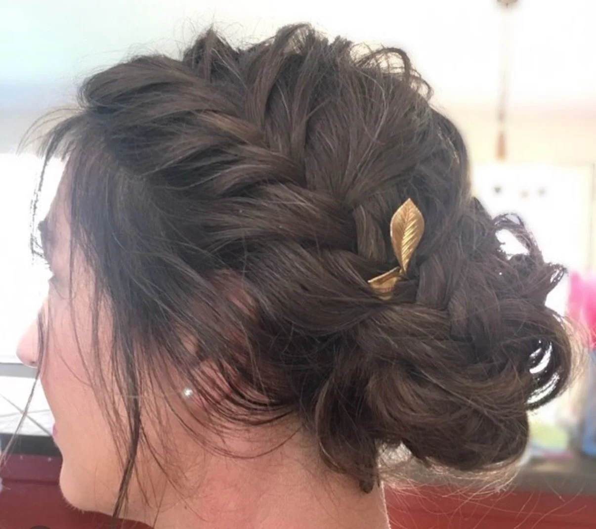 Side view of a woman's hairstyle featuring a loose updo with a French braid, adorned with a decorative gold leaf hairpin.