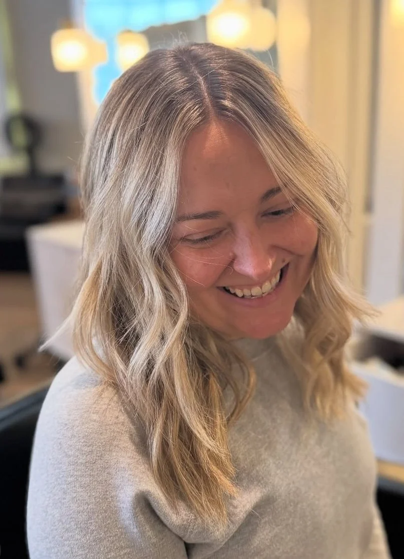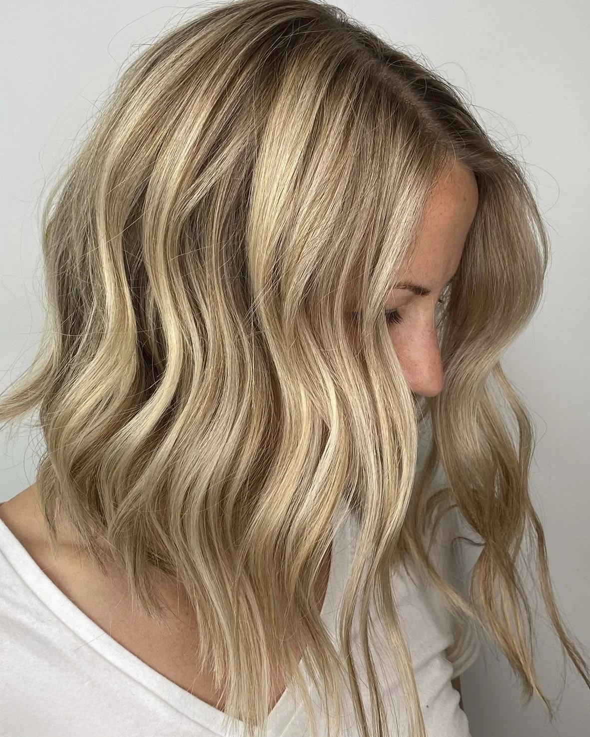 A close-up side view of a woman with shoulder-length, wavy blonde hair with highlights.