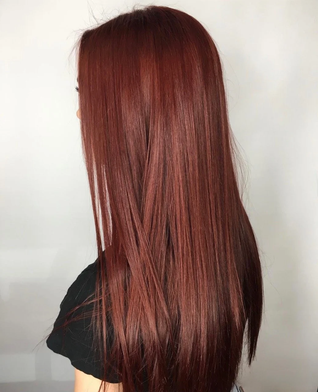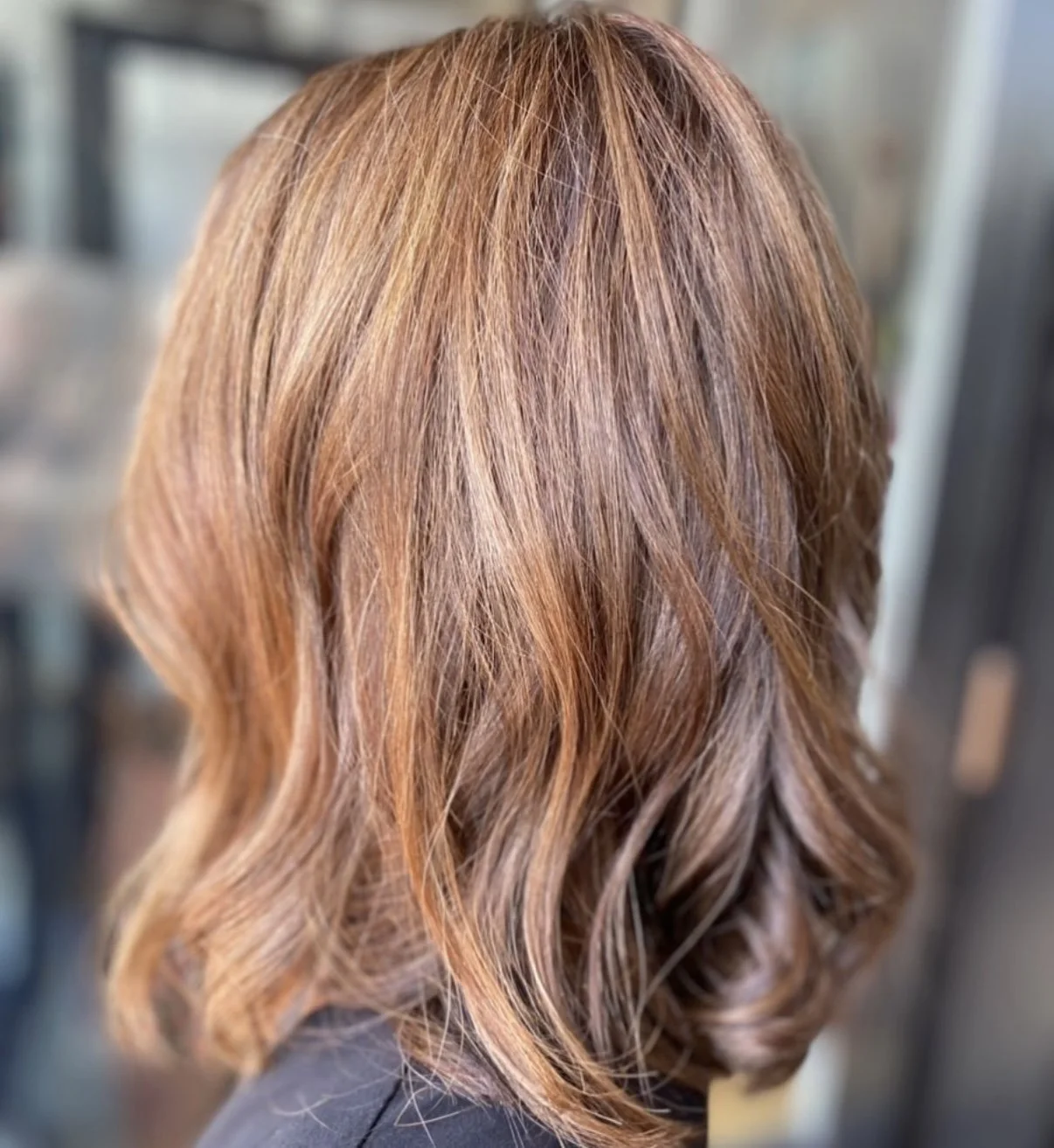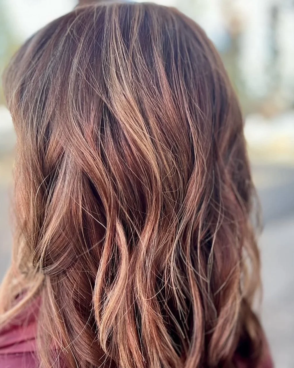 Close-up of a woman's hair with wavy, reddish-brown highlights.