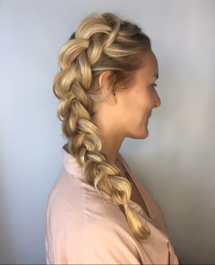 Side view of a woman with long blonde hair styled in a thick braid over her shoulder.