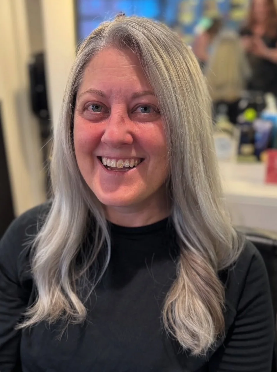 A smiling woman with blonde hair, wearing a black top, in a colorful indoor setting.